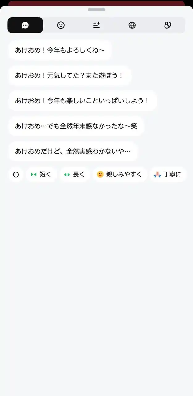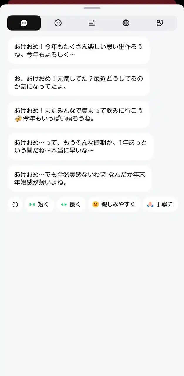 | ▼「あけおめ」と届いたメッセージに対する「LINE AIトークサジェスト」の返信提案例 | ||||||||||||||