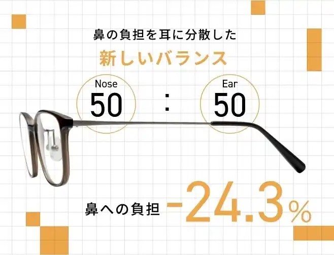 『nosefree』は、モダンの先端にあえて重りを配置することで、鼻側に偏りがちな負荷を後方(耳側)へ分散しています。前(鼻)と後ろ(耳)で重さをバランスよく支える設計により、メガネ全体の重心を安定した位置に保ちます。その結果、鼻への負担を24.3%軽減し、かけた時の軽さや、鼻パッド跡のつきにくさを実現しました。 |