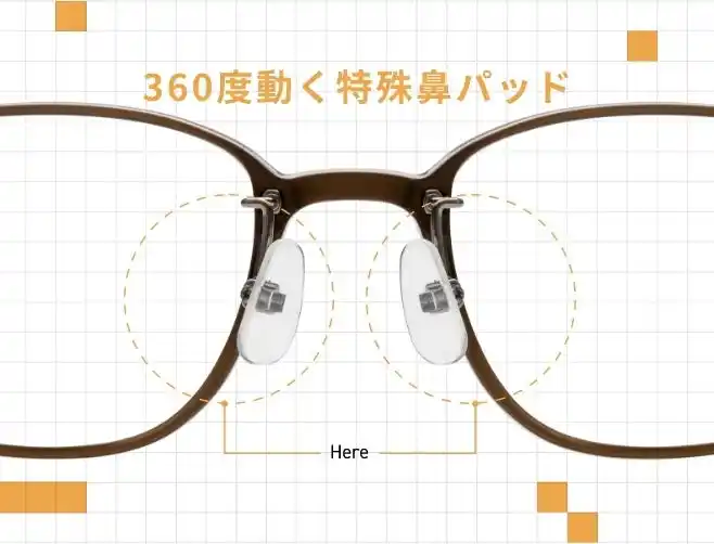 通常の約半分の軽さで、パッド面が360度どの角度にも曲がる特殊な鼻パッド「クビフリーパッド」を採用しています。かける人の鼻の形に合わせてフィットするため、鼻にやさしくなじみ、長時間かけても快適なかけ心地が続きます。 |