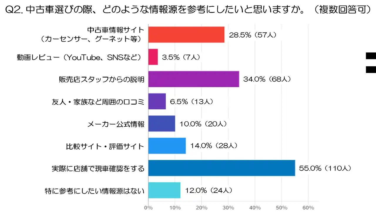 中古車選びの情報源としては、「実際に店舗で現車確認をする」や「販売店スタッフからの説明」が上位を占めました。 |