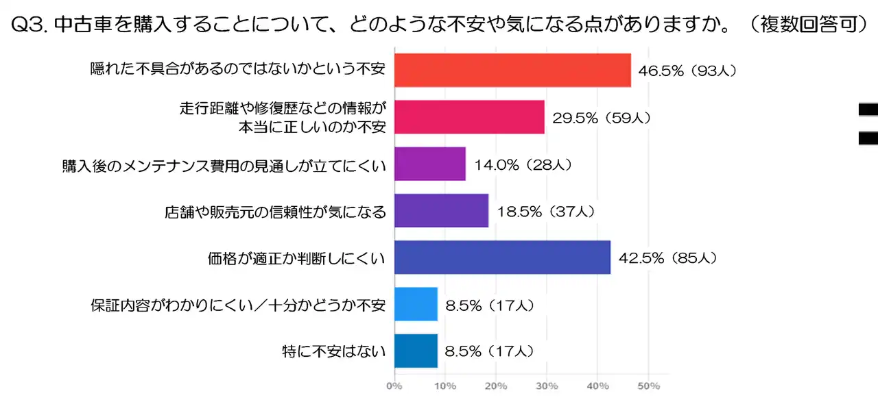また、「特に不安はない」は8.5%(17人)にとどまり、多くの人が何らかの不安を抱えながら中古車購入を検討していることが分かります。 |
