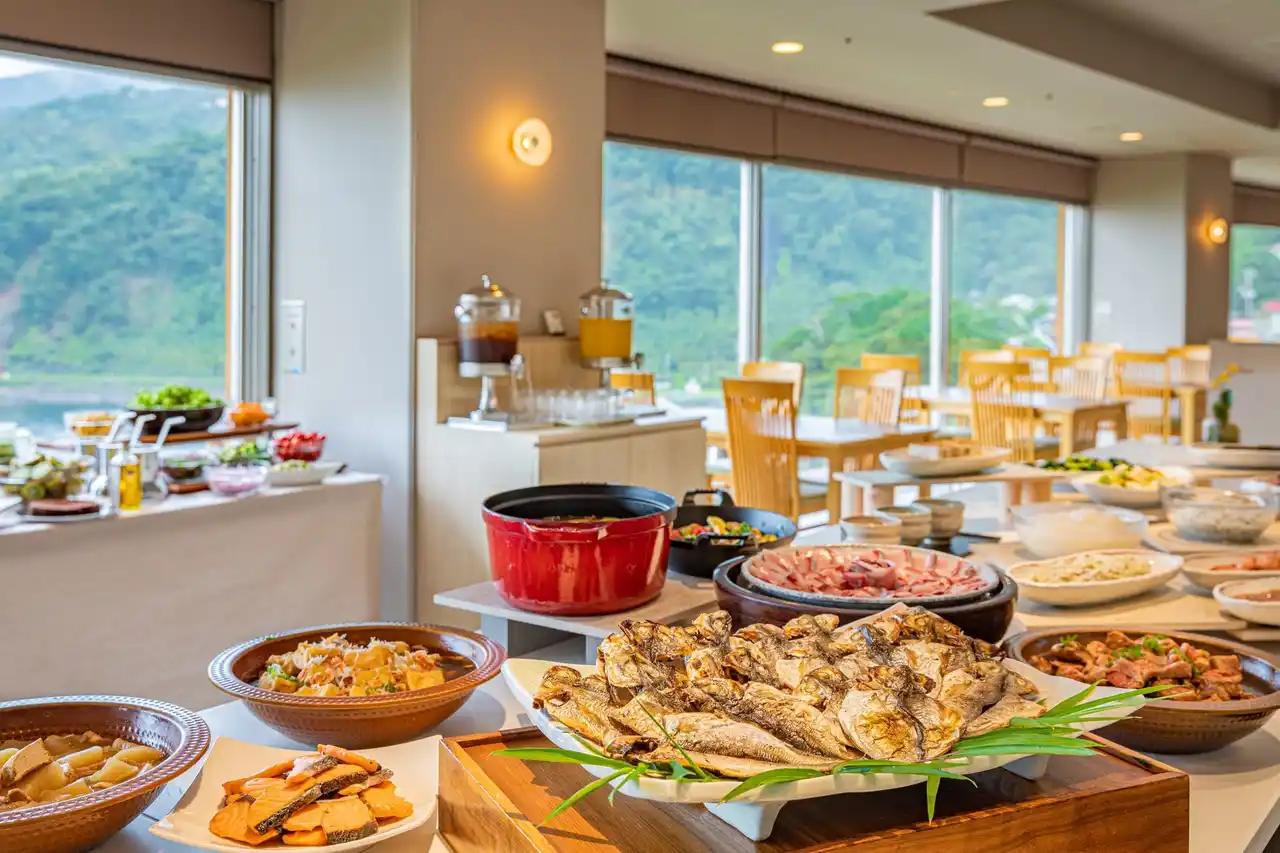 伊豆近海で水揚げされた新鮮な魚介類や、豊かな自然が育んだ山の幸など、厳選した旬の食材をふんだんに使用しています。夕食は素材の旨みを引き出した月替わりの和食コースを、朝食は干物や焼き立ての品が並ぶ約50種類の和洋食バイキングをご用意。窓一面に広がる大海原を眺めながら、心満たされるひとときをお過ごしいただけます。 |