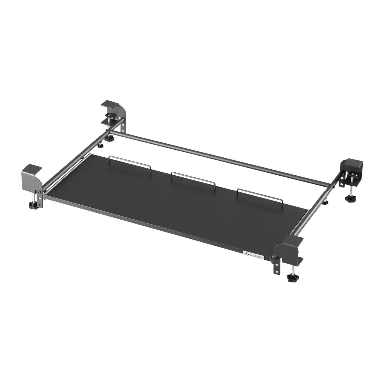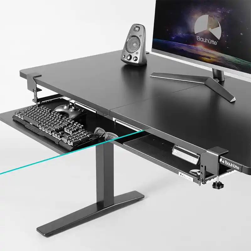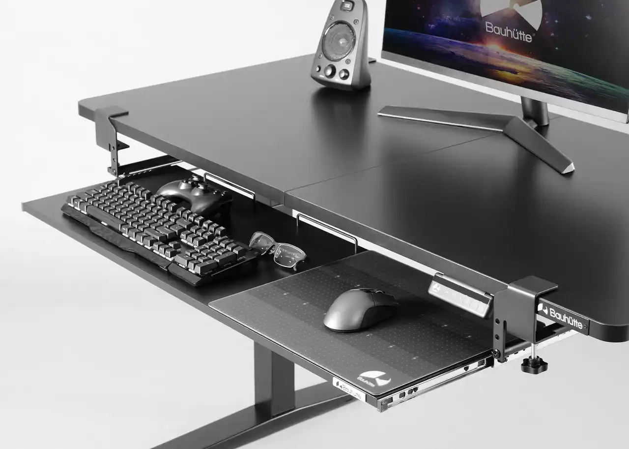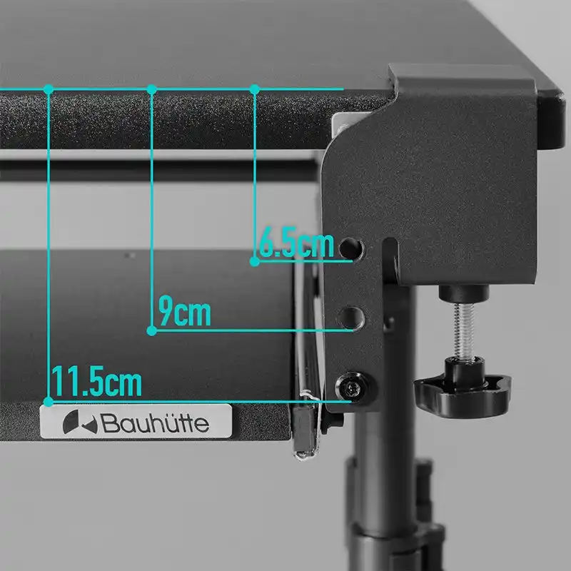 後付けキーボードスライダーの最大の課題である「使用時のグラつき」を徹底的に解消するため、バウヒュッテ独自の4点固定機構を旧モデルより踏襲。デスクの天板を挟み込むクランプ式を採用しているため、天板にネジ穴を空けずに強固に固定できます。 |