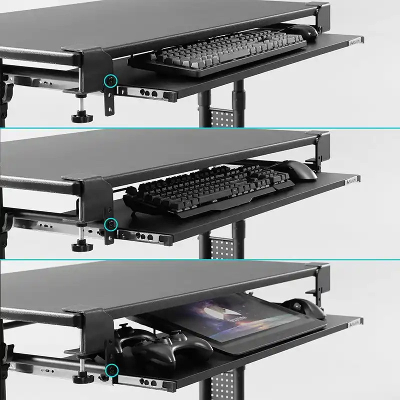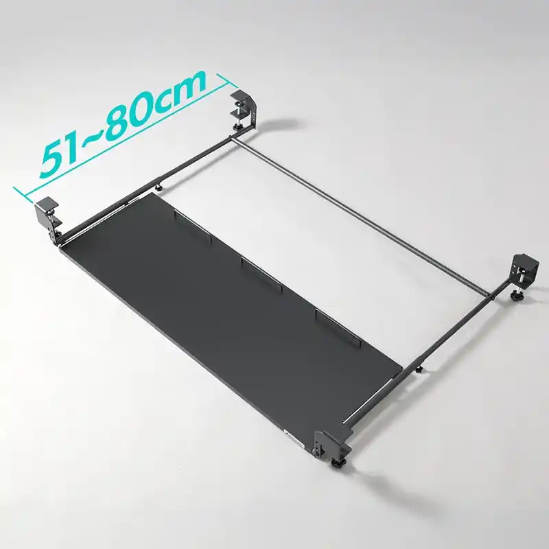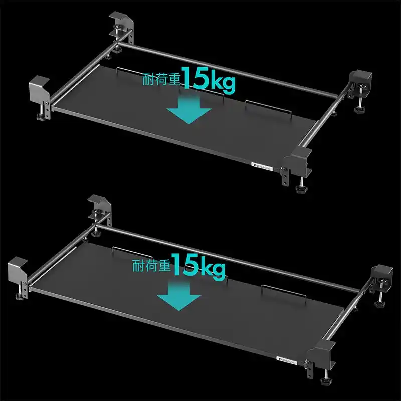 本製品は、最大横幅100cmという大型の天板をデスク下に追加することで、メイン天板を占有しがちなキーボードやマウスをスマートに収納。また、ただ広いだけでなく、タイピング時にもグラつかない4点固定による圧倒的な安定性を追求しました。高さは使用するデバイスや環境に合わせて3段階での調整が可能。さらに、取り付ける奥行きを51~80cmまで調整できるので、幅広いサイズのデスクへの取付けが可能です。 |