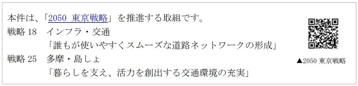 東京都では、多摩地域のさらなる発展に向け、交通渋滞の解消や拠点間の連携強化に資する骨格幹線道路の整備に重点的に取り組んでいます。 |