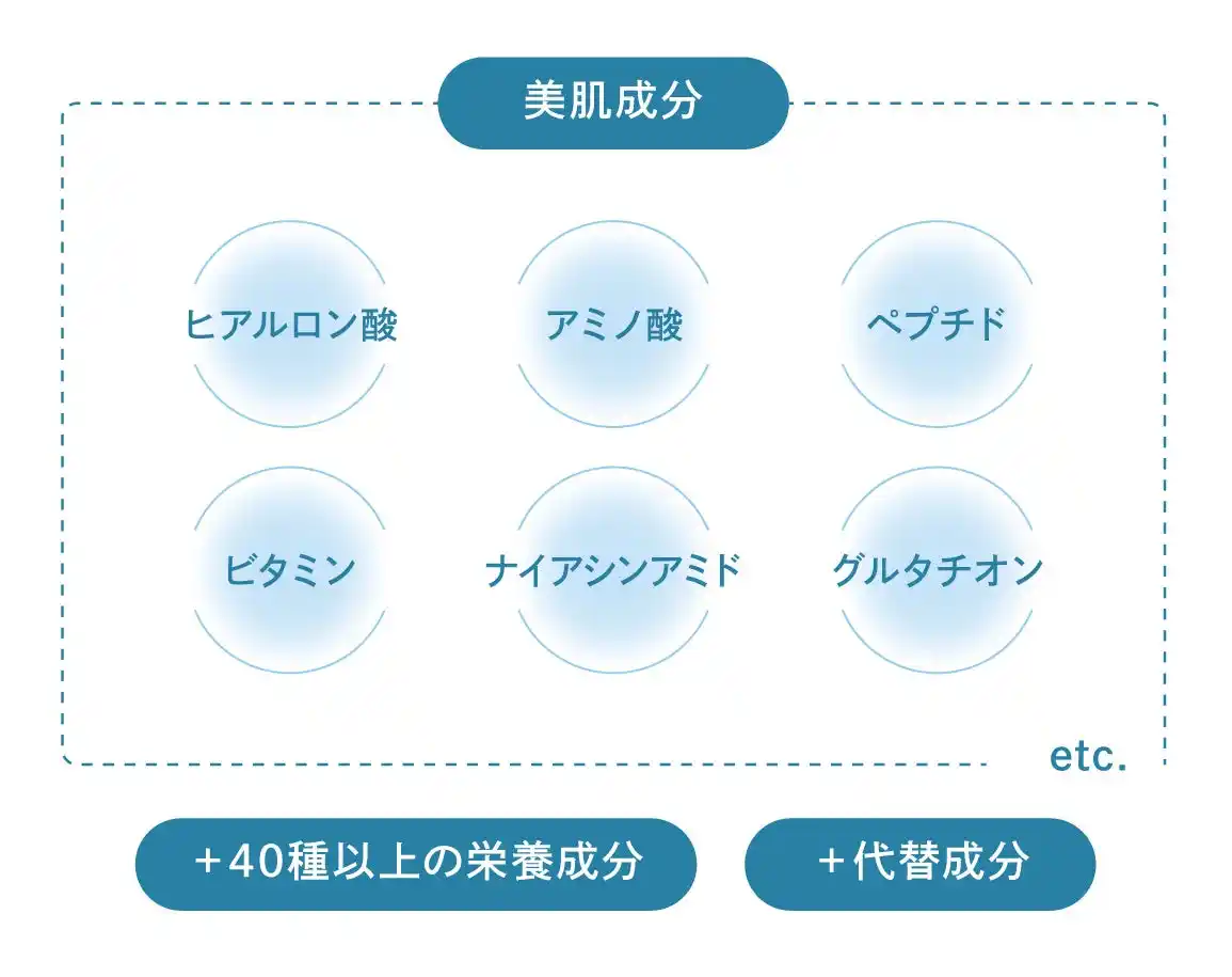 ヒアルロン酸やアミノ酸、ペプチド、ビタミン、ナイアシンアミド、グルタチオンなど美肌成分、栄養成分を40種以上含み、MPF製剤と80%は同じ成分で構成。残りの20%はセルフケアで確かな効果を感じながら安心してお使えいただけるように同効果の代替成分を用いました。 |