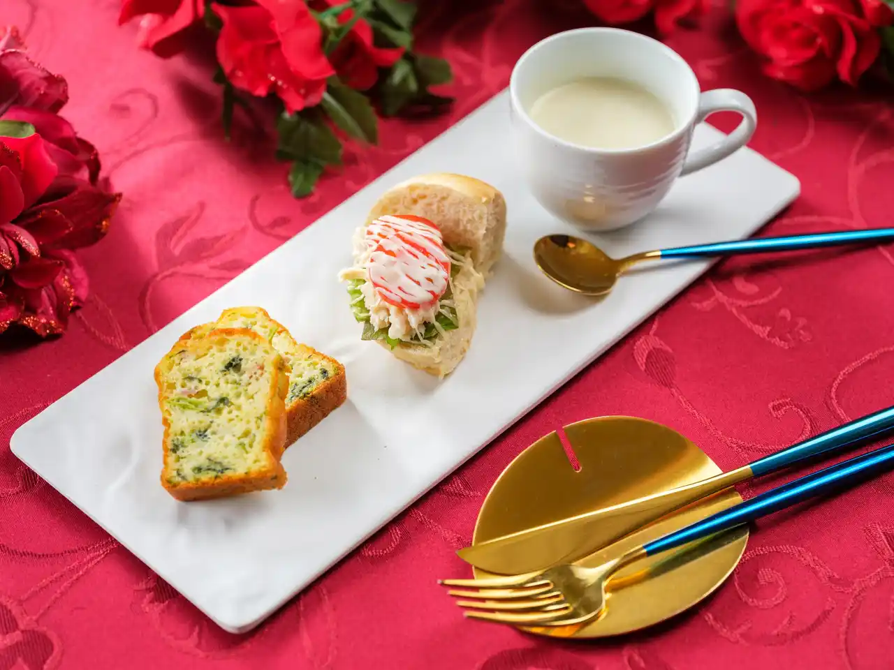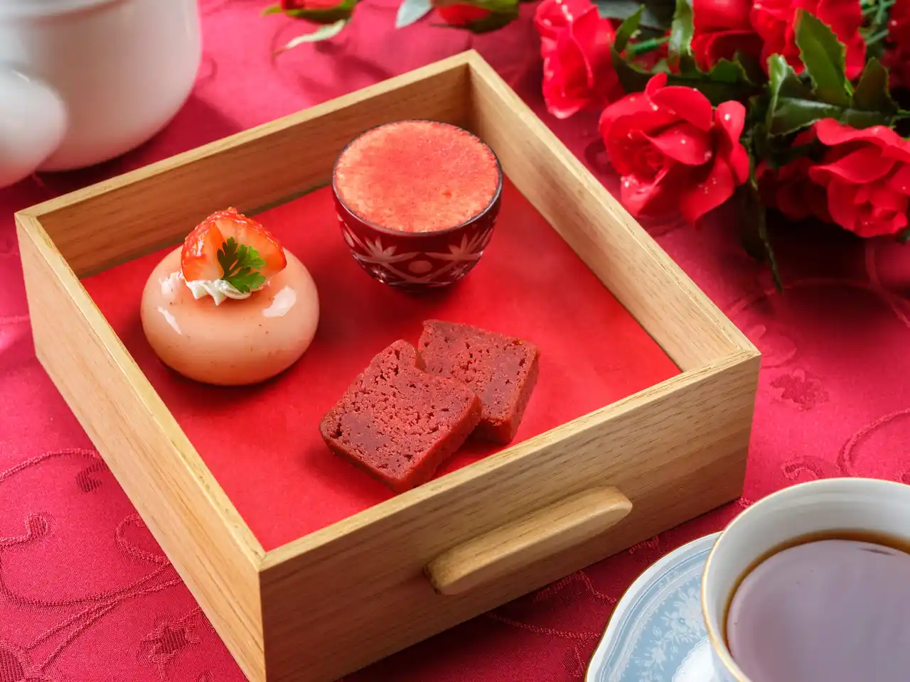オリジナルの木箱の引き出しを開けると、華やかないちごスイーツが美しく並び、目にも楽しい優雅なティータイムを演出します。いちごのタルト、いちごのミルフィーユ、いちごのエクレア、いちごと神戸ワインのジュレなど、いちごの甘みと酸味を活かしたスイーツをラインナップ。さらに、いちごのクレープ巾着包みやいちごとチョコレートのドームといった、食感や味わいの変化も楽しめる品々を揃えました。セイボリーには蒸し鶏のベーグルサンドやクラムチャウダーなどを取り入れ、甘さの合間にほどよい満足感を添えています。 |