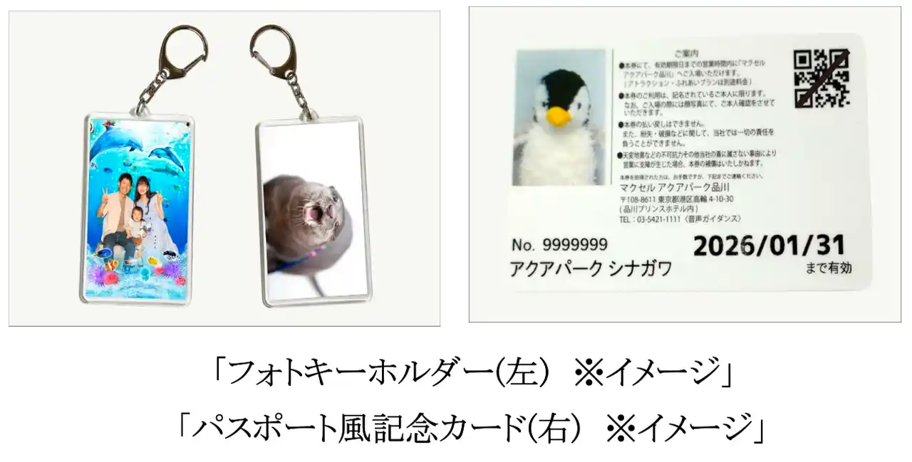 当日撮影したご家族写真を使った、世界にひとつだけのフォトキーホルダー。“はじめての水族館”の瞬間を、いつでも手に取って思い出せる記念品です。さらに、プラン当日の日付が刻まれた「パスポート風記念カード」もプレゼント♪ |