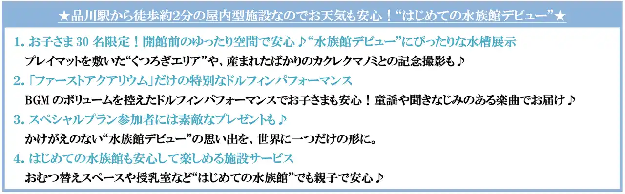 都心・品川駅から徒歩約2分というアクセスの良さも魅力の当館が、お子さまが安心して海の世界にふれあい、ご家族みんなで“はじめての水族館記念日”を過ごせるひとときをお届けします。 |