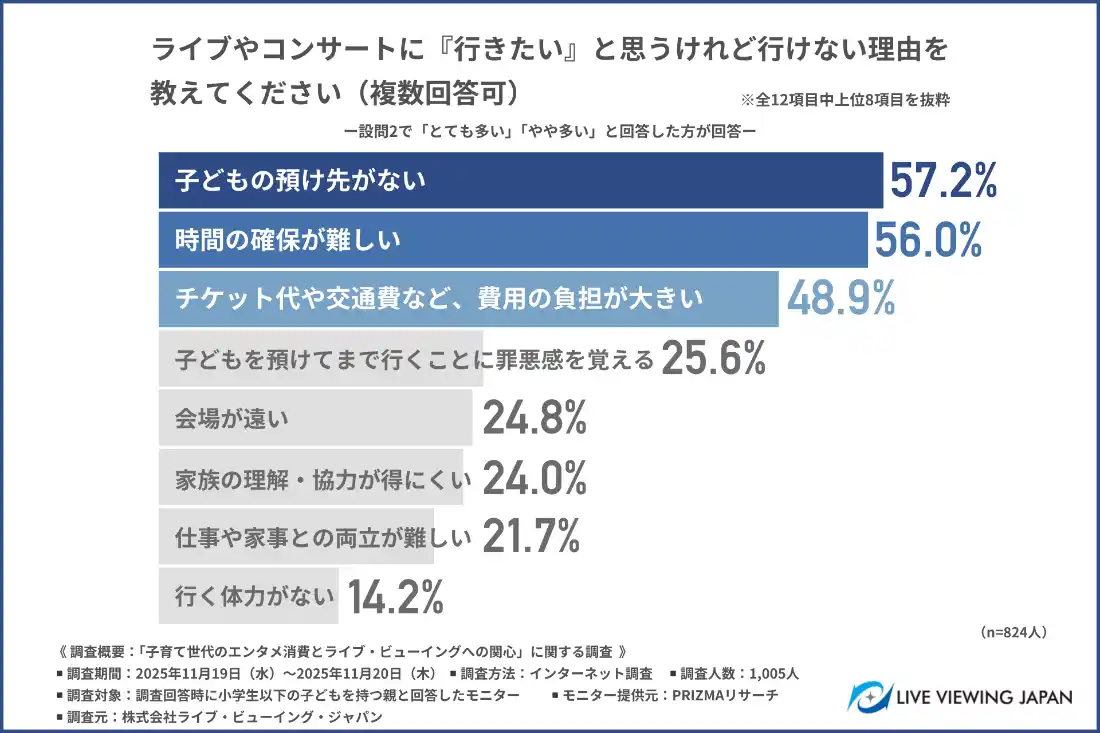 子どものいる親の多くが、ライブやコンサートに行きたいという意欲を持ちながら、参加を断念している状況が浮き彫りとなりました。 |