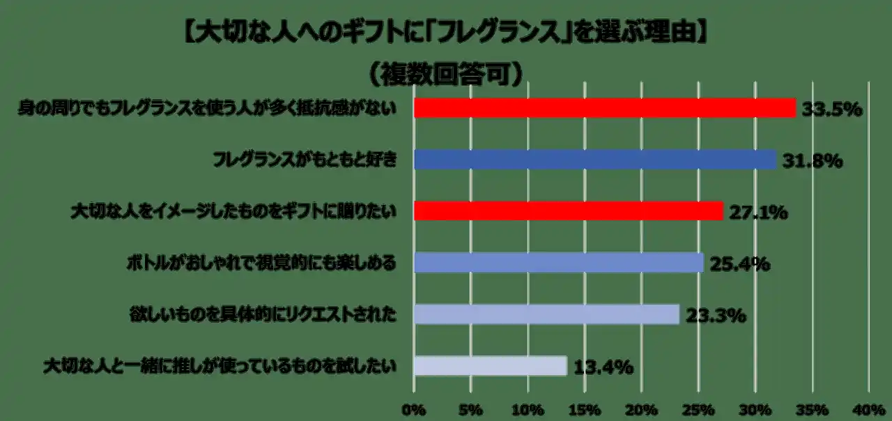 ◆大切な人へのギフトにフレグランスを選びやすくなった人の理由の上位に「身の周りでもフレグランスを使う人が多く抵抗感がない」「大切な人をイメージしたものをギフトに贈りたい」。フレグランスの流行感がギフト需要にも直結。