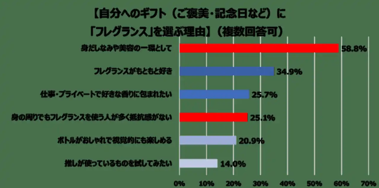 ◆4人に1人が、3年前と比べて「自分へのギフト(ご褒美・記念日)に『フレグランス』を選ぶもしくは検討したい」。身だしなみや美容へのニーズの他、「推しが使っているものを試してみたい」という声も。