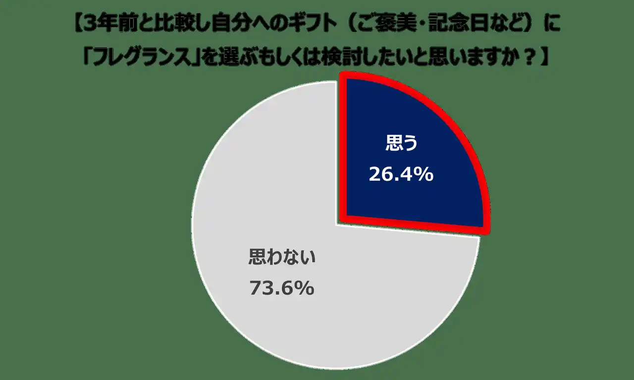 | ◆4人に1人が、3年前と比べて「自分へのギフト(ご褒美・記念日)に『フレグランス』を選ぶもしくは検討したい」。身だしなみや美容へのニーズの他、「推しが使っているものを試してみたい」という声も。 | ||||||||