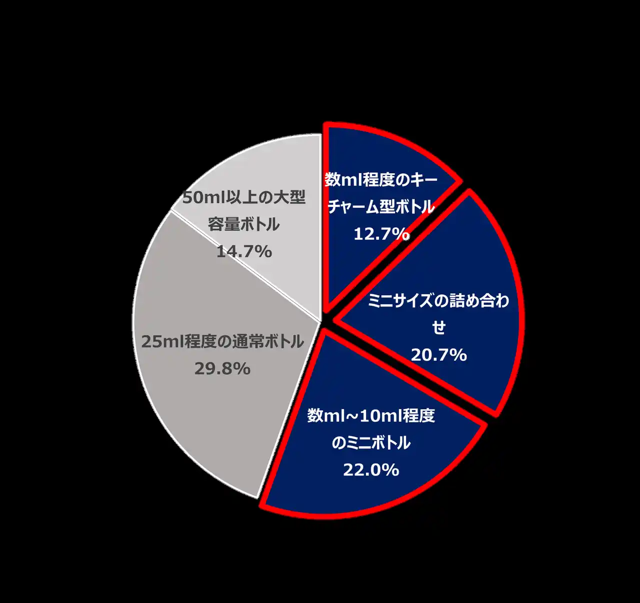 | ◆数ml程度のキーチャーム型・10ml以下のミニボトル・ミニサイズの詰め合わせ等のミニボトル愛用がトレンドに。背景には「少量の香りを試しながら自分に合った香りを見つけたい」という需要を推察。 | ||||||||