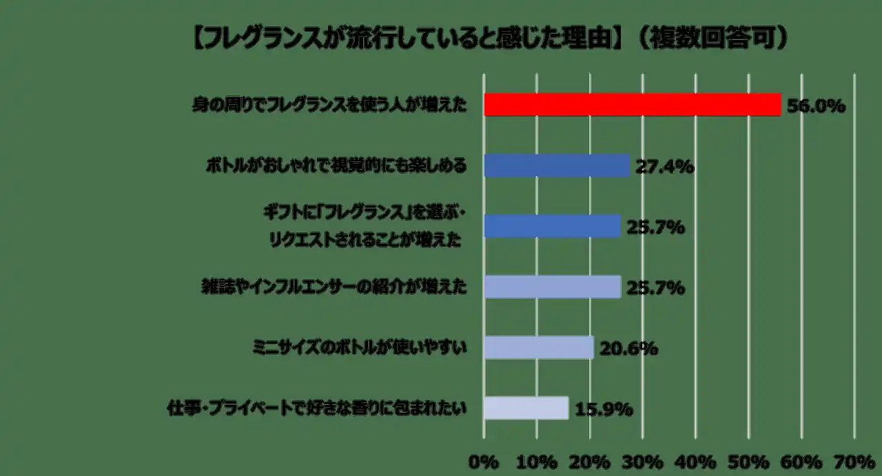 | 「3年前と比較してフレグランスが流行していると感じますか」という質問をしたところ、約4人に1人の25.6%の人が「感じる」と回答しました。感じたことがある人のうち、「身の周りでフレグランスを使う人が増えた」が最も多い理由となりました。「ギフトに『フレグランス』を選ぶ・リクエストされることが増えた」という回答も見られるなど、一般的に香りを身に纏うことのハードルが下がり、仕事・プライベート問わず様々なシーンにおいてフレグランスを使用しやすくなっていることが推察できます。また、回答数上位6項目には「ボトルがおしゃれで視覚的にも楽しめる」という、香りだけでなくパッケージのデザインを評価する声も見受けられました。 | ||||||||
