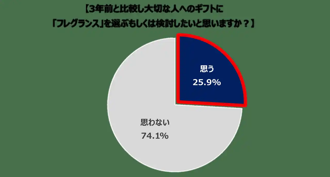 | 「3年前と比較し大切な人へのギフトに『フレグランス』を選ぶもしくは検討したいと思いますか」という質問をしたところ、4人に1人の25.9%が「はい」と回答しました。「身の周りでもフレグランスを使う人が多く抵抗感がない」が理由として最多だったほか、「大切な人をイメージしたものをギフトに贈りたい」も多数の回答を占めました。フレグランスを使用する人が増えたという実感が、大切な人への香りを贈る後押しになっていると推察できます。 | ||||||||