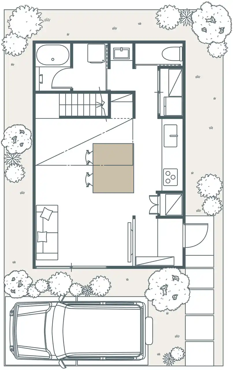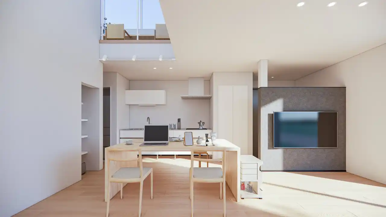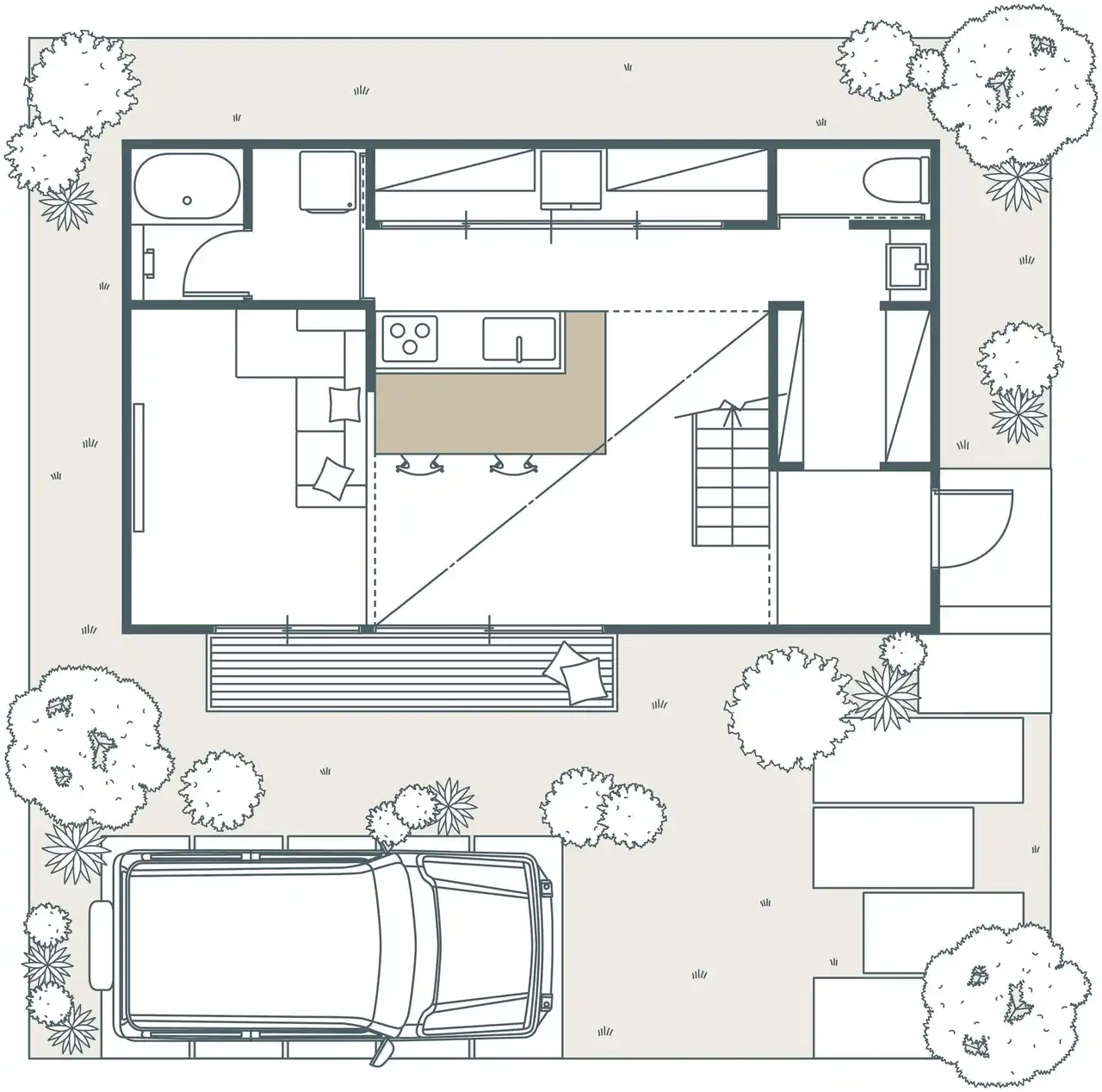 家族や友人と過ごす「シェア空間(パブリック)」と、一人の時間を大切にする「プライベート空間」を高低差で区切り、緩やかにつながる暮らしを実現します。 |