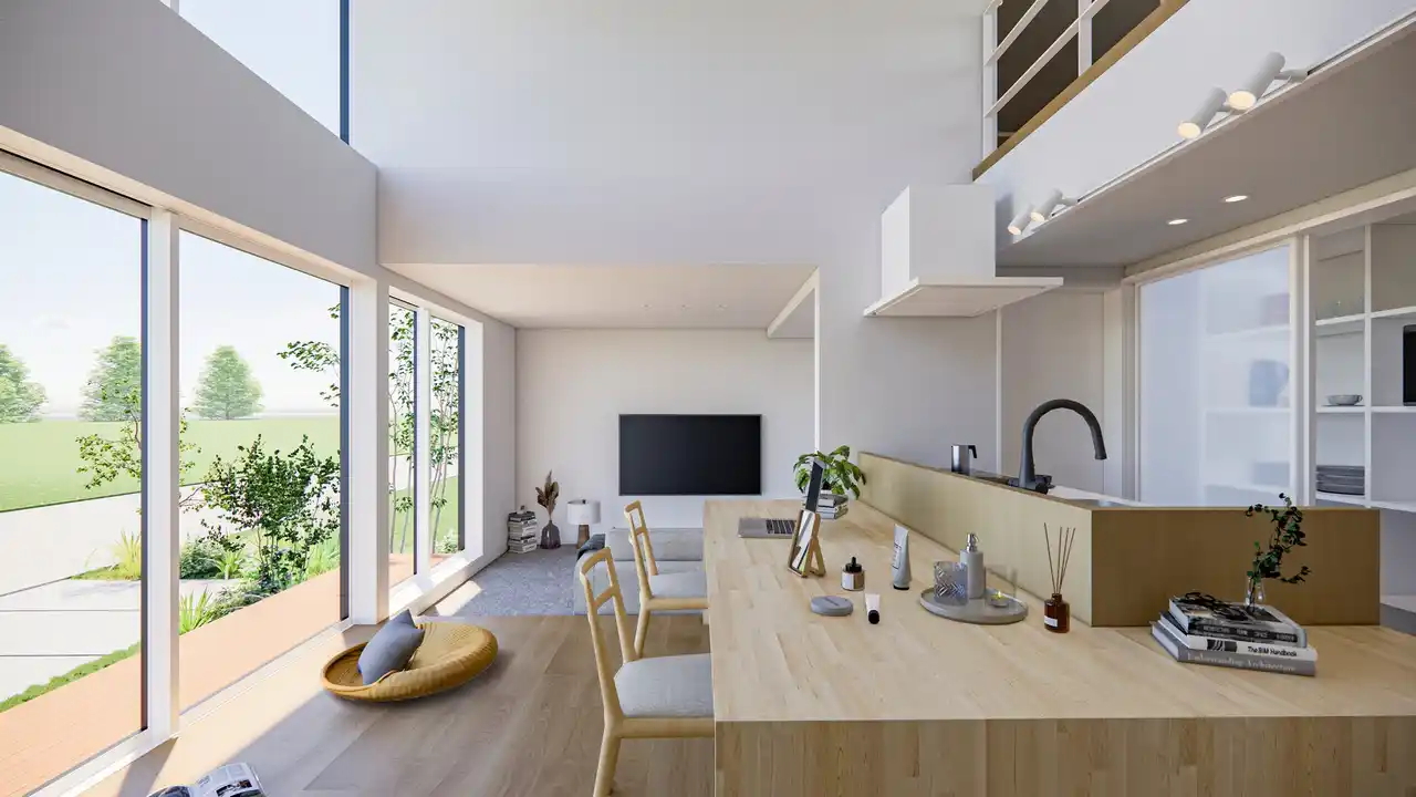 「植物との調和空間」をコンセプトに、屋内外をシームレスにつなぎ、普段の生活と植物の居場所がひとつながりになる住まいを提案。 |