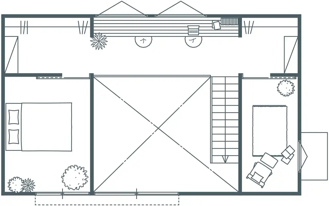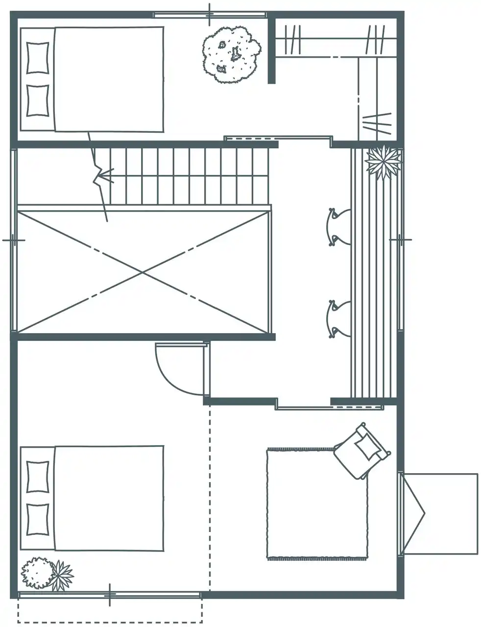 2階にはロフト風のシェアスペースと、死角を利用してゆるや かにつながりつつも一人の時間を確保できる個室を配置 |
