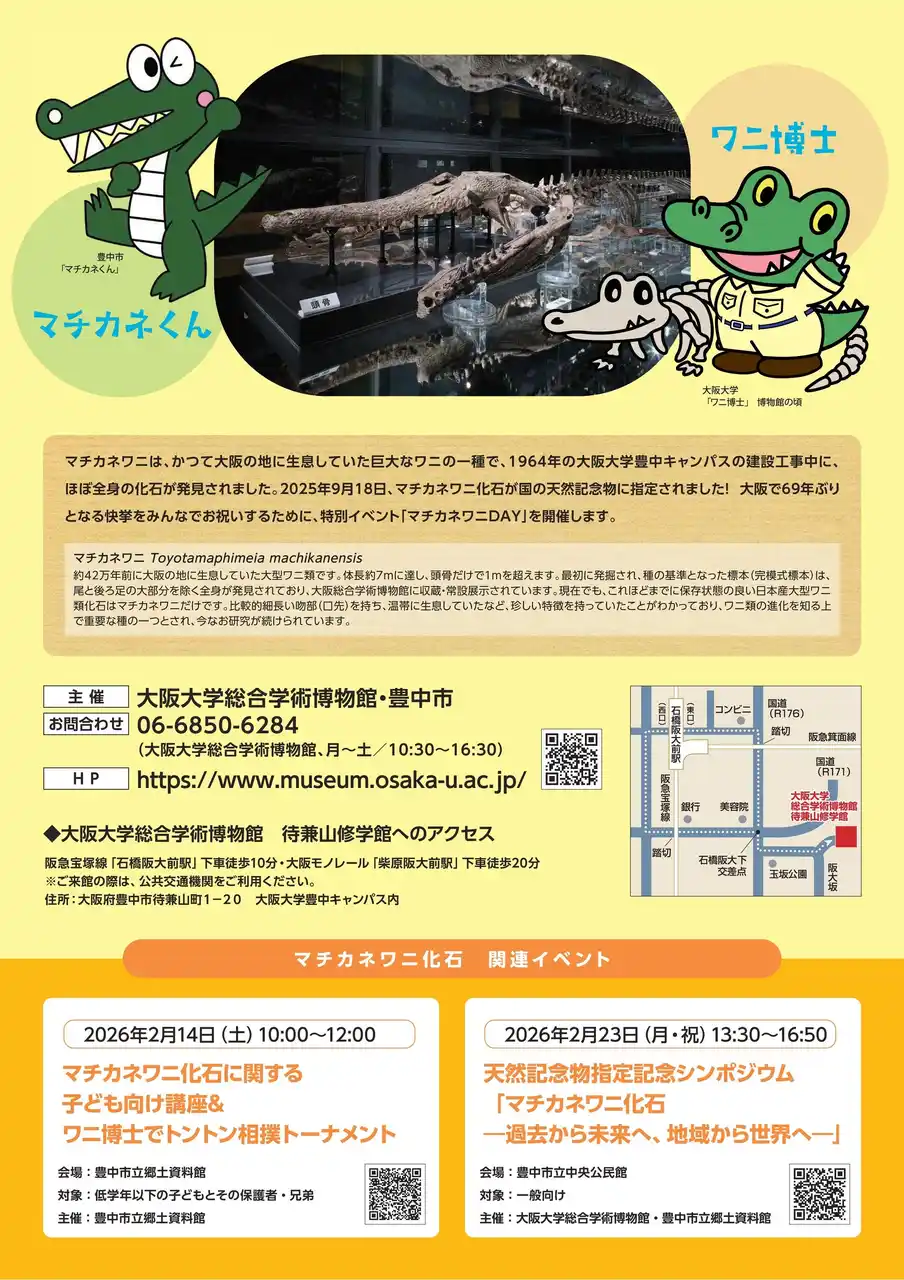 豊中市は、大阪大学総合学術博物館と連携し、「マチカネワニ化石」が国の天然記念物に指定されたことを記念した特別イベントを2月に開催します。これは大阪で69年ぶりの快挙を祝うもので、親子向けの体験イベントや専門家によるシンポジウムなど、学びと楽しさを兼ね備えた内容です。 |
