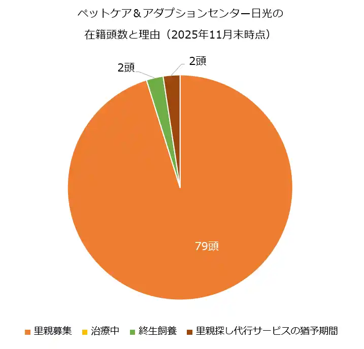 現在、ペットケア&アダプションセンター日光には2025年11月末時点で83頭が生活し、主に治療を終えた、または回復期にある79頭が里親を募集中です。なお、2 頭は里親探し代行サービスの猶予期間中のため募集待ち、2頭は終生飼養を行う予定です。 |