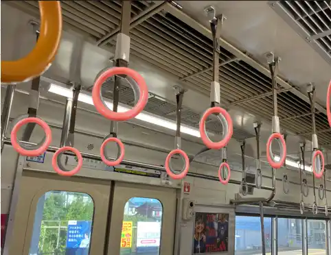 同車内は一部の吊り輪を桜に見立てた「ピンク色の吊り輪」で彩り、メッセージ広告で車内をジャックします。また、桜の形をかたどった系統板を掲出します。 |