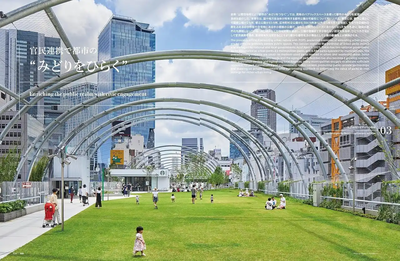 | 前章「POPS(民有の公共空間)により都市の"みどりをつなぐ"」では、民有のパブリックスペースを使って都市のみどりを拡張していく事例を紹介した。本章では、国や地方自治体が所有する都市公園の可能性について取り上げる。東京には、都市公園として国営公園が2カ所、都立公園が83カ所、区市町村立公園が8,586カ所あり(令和5年4月1日現在)、そのうち圧倒的な数を占めるのが市街や住宅地にある中小規模の公園だ。なかには現代のニーズに合わなくなったものもあり、施設の老朽化も課題となっている。人口減少などで地域財政が逼迫し、公園の整備まで手が回らない状況もある中、ひとつの方法として官民連携を進め、民間資本を活用することでより豊かな都市生活の舞台として公園の価値向上が期待される。 | ||||||