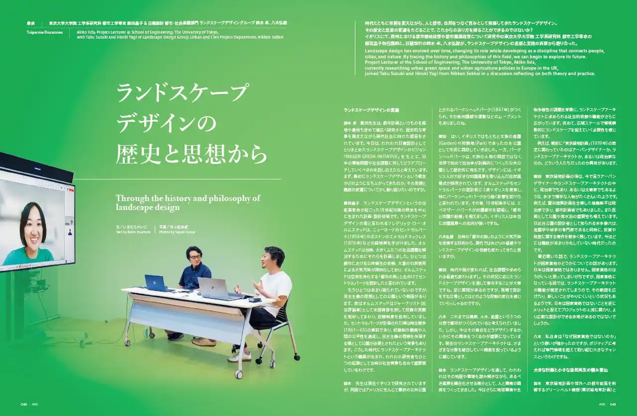 | 時代とともに役割を変えながら、人と都市、自然をつなぐ営みとして発展してきたランドスケープデザイン。 その歴史と思想の変遷をたどることで、これからのあり方を探ることができるのではないか? イギリスにて、欧州における都市緑地政策や都市農業政策について研究中の東京大学大学院 工学系研究科 都市工学専攻の飯田晶子特任講師と、日建設計の鈴木 卓、八木弘毅が、ランドスケープデザインの思想と実践の両面から語り合った。 | ||||||