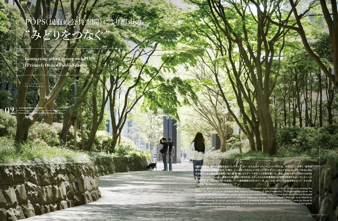 | 米国の造園家・都市計画家であるフレデリック・ロー・オルムステッド(1822~1903)は、19世紀にいち早く「自然は贅沢品ではなく必需品である」と唱え、ニューヨークのセントラル・パークやボストンのエメラルドネックレスをはじめとする数多くの公園や緑地開発に取り組み、ランドスケープデザインの礎を築いた。現在、日本ではPOPS(Privately Owned Public Spaces/民有の公共空間)と呼ばれる、オフィスビルや商業施設など民間が所有するオープンスペース(公開空地)をつないでみどりを拡張していく緑地開発が行われている。ここでは、そうした公開空地によって“みどりをつなげる” 取り組みについて紹介する。 | ||||||