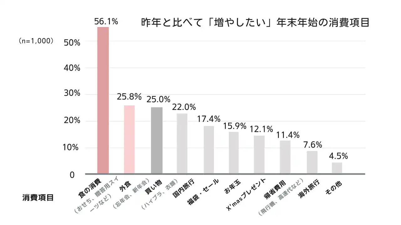 年末年始のイベントを楽しむための食品の消費意欲は物価高騰のなかでも衰えず。食にまつわる消費を「昨年より増やす」と回答した割合は56.1%でトップ。 |