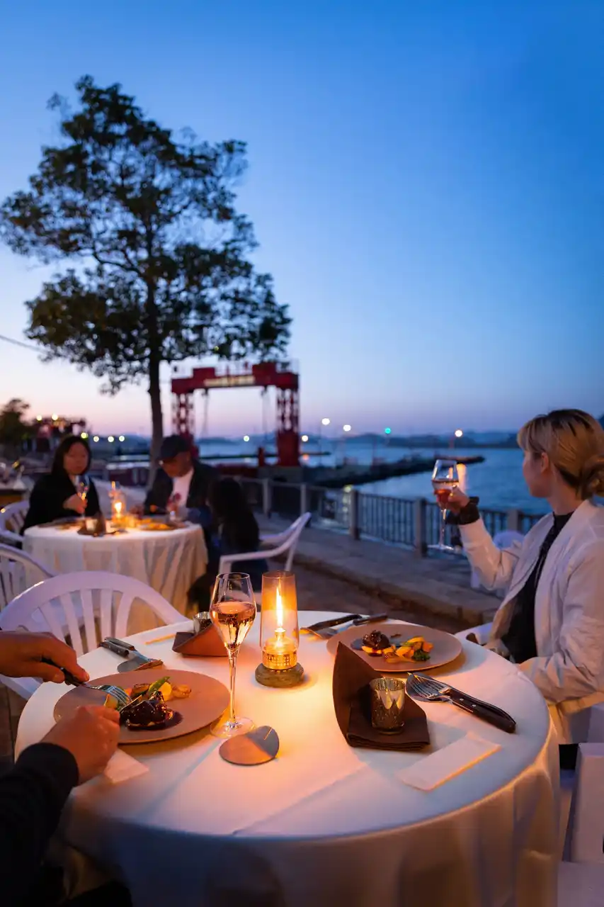 | こうした状況に危機感を抱いた地元事業者や観光協会、行政が連携し、港を「交通の港」から「交流の港」へと再定義する取り組みとして、2022年11月に誕生したのが「せとうちみなとマルシェ」です。「瀬戸内の”うまい”に出会える海辺のマルシェ」をコンセプトに、焼豚玉子飯や鉄板焼鳥などのご当地グルメや地物魚の競り市、スイーツやクラフト雑貨など、多種多様な店舗が数多く出店。美しいしまなみの景色をバックに、カラフルなテントが立ち並ぶロケーションも大きな魅力の一つです。 | ||||||||