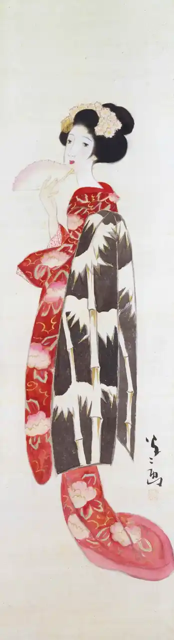 蔵を改装した展示室では、雪合戦をするこどもたちが愛らしい《雪だるま》や、椿の柄のきものを着た女性を描いた《満願の日》などを展示。 |