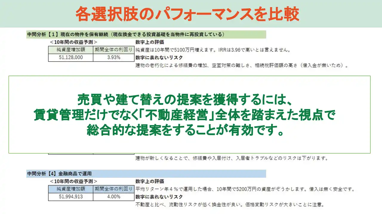 本研修を通じて育成された社員がオーナー様の資産経営に深く寄り添うことで、当社は「資産価値の向上を共に目指すパートナー」として財務面の改善から長期的な資産形成まで伴走します。オーナー様の思考や判断プロセスへの理解が高まることで、より現実的で実行力のある提案が可能となり、その結果、適切な運営判断や改善提案が行われ、入居者様にとってより快適で安心できる住環境の提供にもつながります。こうした一連のプロセスを支えられる人材を育てることが、プロパティマネジメント本部としての専門性向上と組織力強化にもつながっています。 |