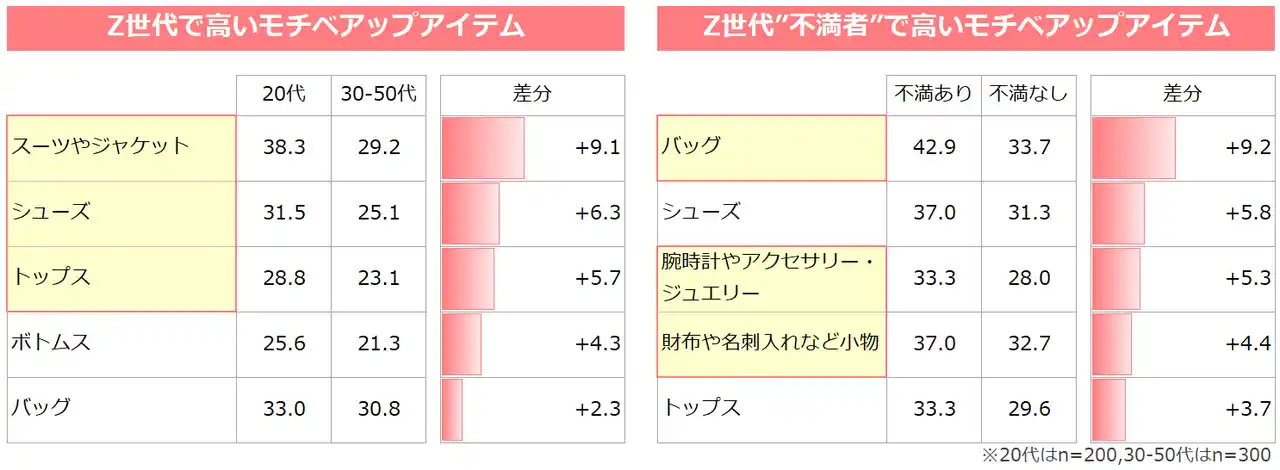 | 最後に、世代間、さらにZ世代内の「服装に対する不満の有無」によって、どのファッションアイテムがモチベーションに影響を与えるかを比較しました。<data3> | |||