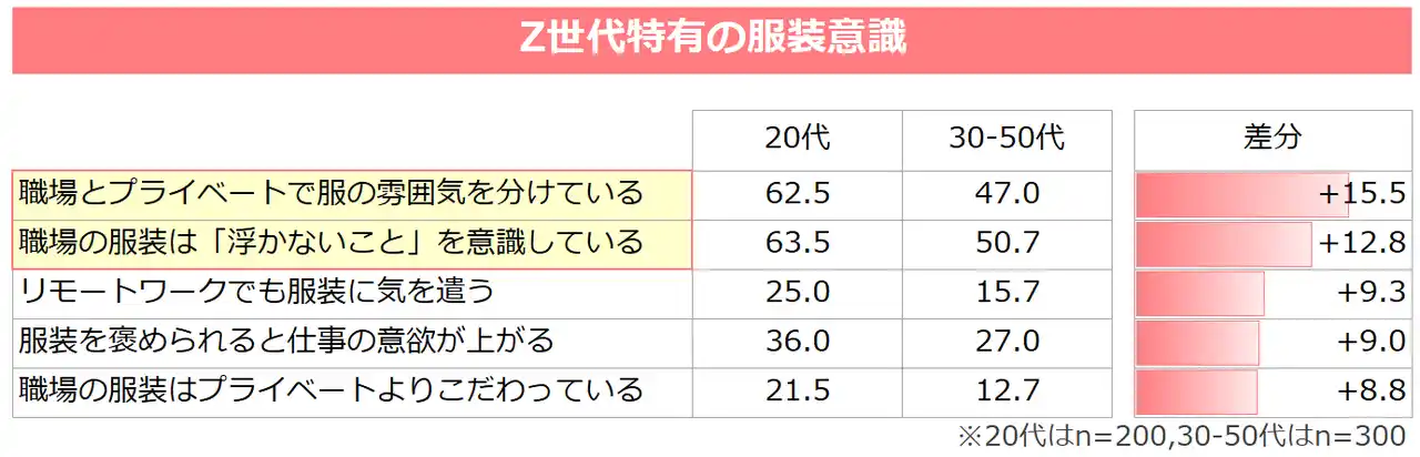 | Z世代では、30~50代と比べて「職場とプライベートで服の雰囲気を分ける(+15.5pt)」、「浮かないことを意識する(+12.8pt)」といった傾向が顕著であり、TPOを強く意識している様子がうかがえます。また「服装を褒められると仕事の意欲が上がる(+9.0pt)」、「職場の服装はプライベートよりもこだわる(+8.8pt)」といった意識も高く、評価や自己表現の手段として職場の服装を捉えていることがわかります。 | |||