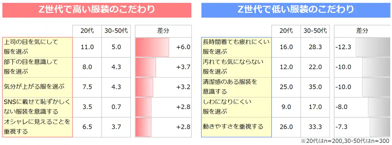 | このように、Z世代にとって職場の服装は単なる仕事着ではなく、周囲からの評価や自己演出を意識した“パフォーマンスツール”であることが示唆されます。服装を通じて「見られる自分」を整えることで、日々のモチベーションにつなげていると考えられます。 | |||