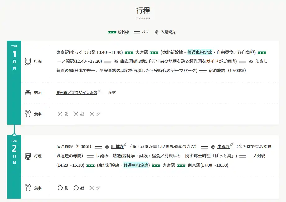 世界遺産の「中尊寺」や「毛越寺」、日本最古の鍾乳洞「幽玄洞」や日本で唯一平安貴族の邸宅を再現した「えさし藤原の郷」へご案内。 歴史と自然を満喫した後は、ブランド牛「前沢牛」と郷土料理「はっと」を味わう一関御膳。さらに、創業100年超の老舗「世嬉の一酒造」で見学・試飲・お買い物も楽しめる、奥州の魅力を凝縮した2日間のツアーです。 |
