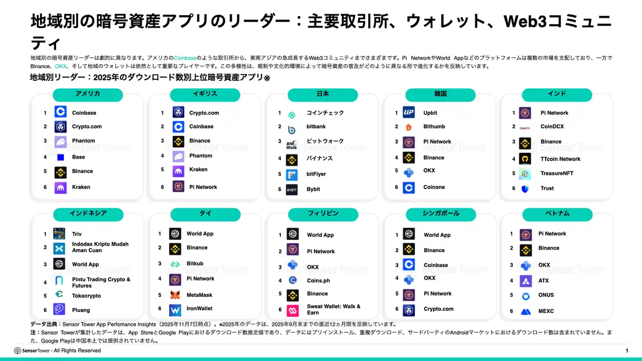 アプリダウンロード数6年連続「国内No.1*」の暗号資産取引サービス「Coincheck」を運営するコインチェック株式会社(本社:東京都渋谷区、代表取締役:蓮尾 聡、以下、当社)は、Sensor Tower調査『2025年投資・資産管理アプリ市場と広告トレンド』レポート(以下、本レポート)における「地域別の暗号資産アプリのリーダー」日本カテゴリで1位を獲得したことをお知らせいたします。 |