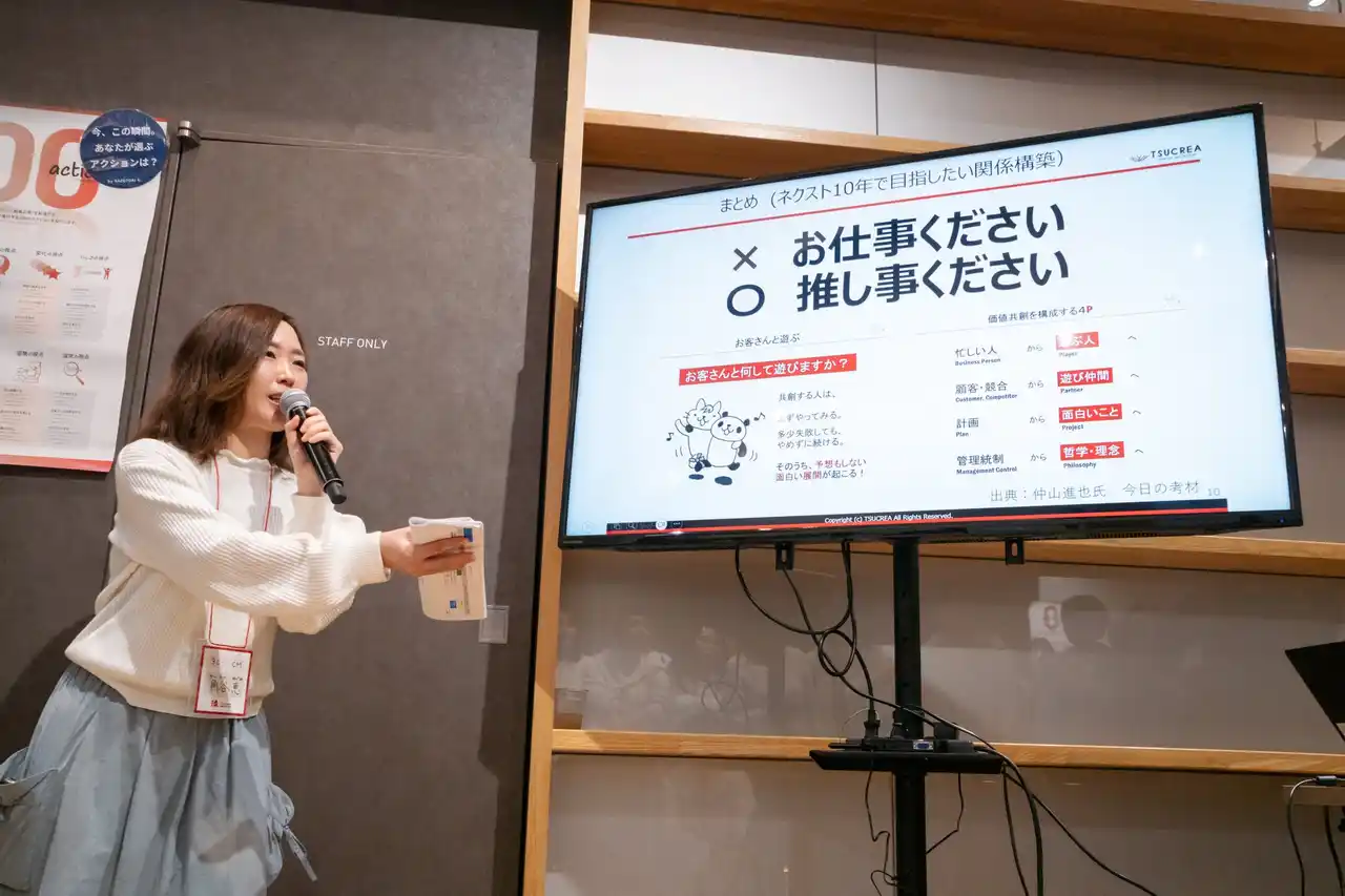 続く交流パートでは、クイズ企画や「なるほど the ツクリエ」、社員によるピッチコンテストなどの参加型コンテンツを実施。軽食や飲み物を囲みながら、仕事の枠を越えた対話が自然と生まれ、普段は接点の少ない社員同士がゆるやかに交流する場となりました。 |