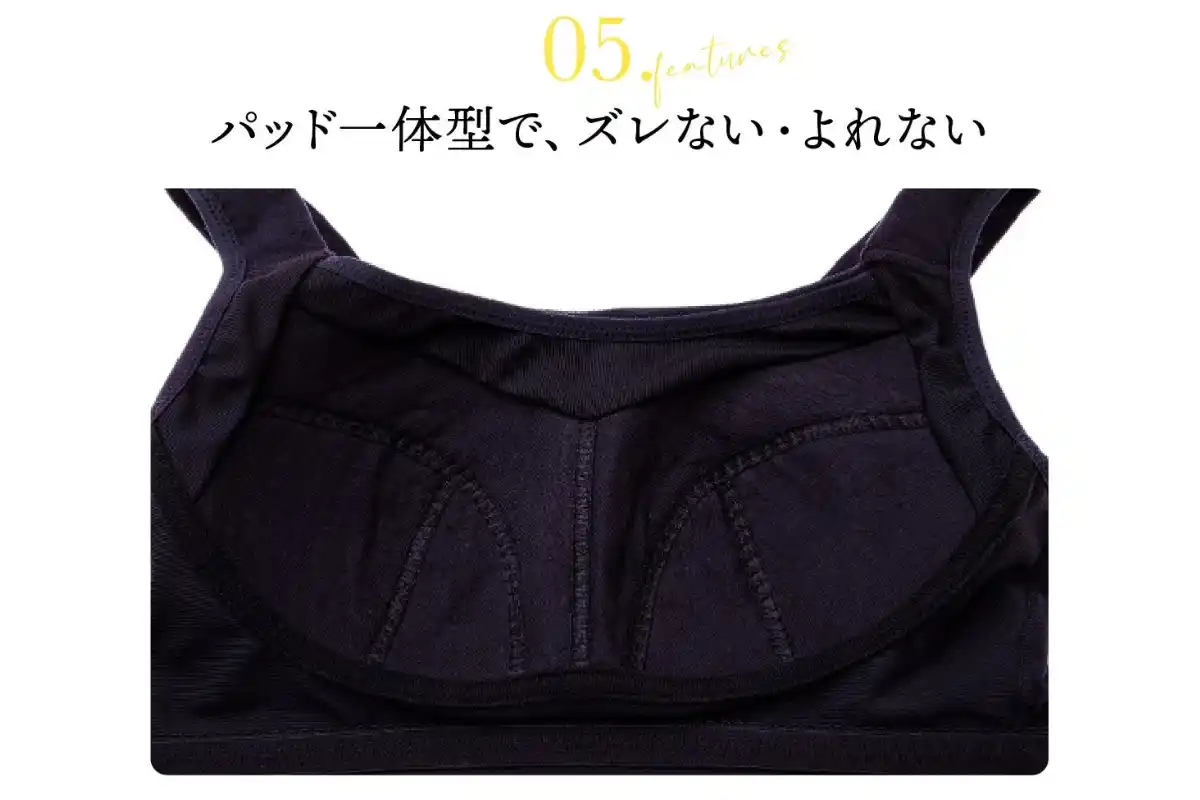 | そんな考えのもと、締めつけ感を抑えながらも、ノンワイヤーでは不安になりやすいバストを、やさしく包み込む設計を目指しました。 | |||||||||||||