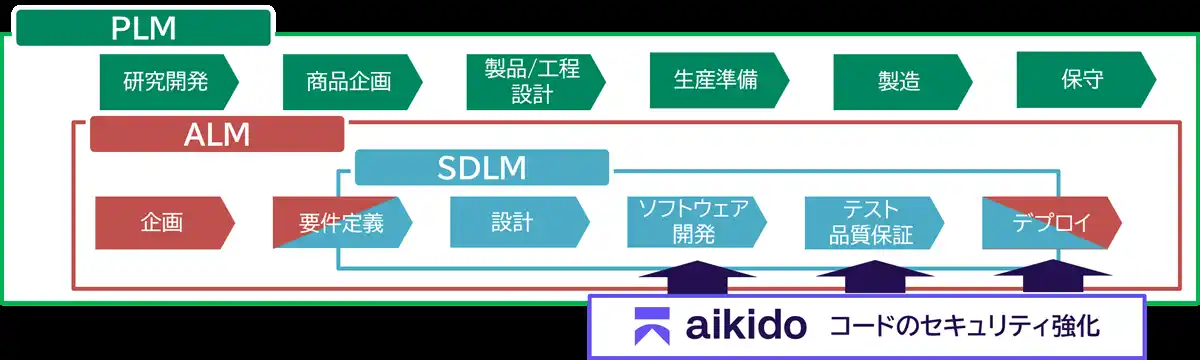 製造業の製品開発では、PLM(製品ライフサイクル管理)の下にALM(アプリケーションライフサイクル管理)があり、その中でSDLM(Software Development Life Management)(※9)が要件定義・設計・開発・テスト・デプロイといったソフトウェア開発工程を担います。Aikido Securityは、このSDLMの各工程にまたがって「コードのセキュリティ強化」を組み込み、OSSの脆弱性管理、セキュアコーディング、SBOM/GRCデータの提供までを継続的に支援します。 |