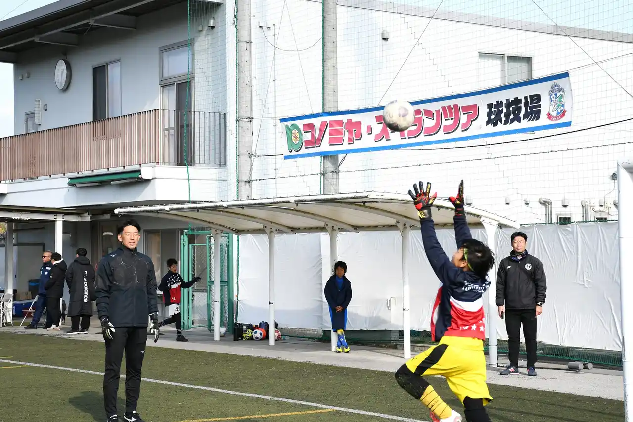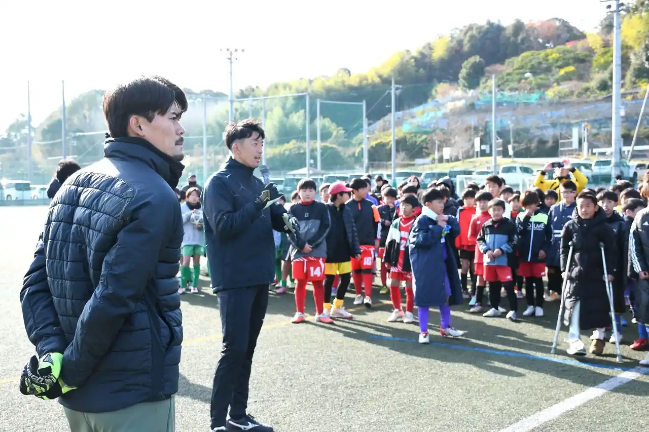 GKクリニック終了後は、コノミヤ・スペランツァ球技場に試合に来ていた小学生が全員集合。サイン入りグッズなどをプレゼントするじゃんけん大会で盛り上がりました。閉会にあたって、権田選手は、「これだけは負けないっていう自分だけの武器をつくってください」と負けない強みをつくることが日本代表にもつながると話しました。また、「ヨドコウ桜スタジアムやノエビアスタジアム神戸にJリーグの試合を見に来て、選手たちの真似をして、考えて練習をしてくれたらと思います」とアドバイスを送りました。にぎやかに行われた1日は、全員集合の記念写真を撮って、幕を下ろしました。 |