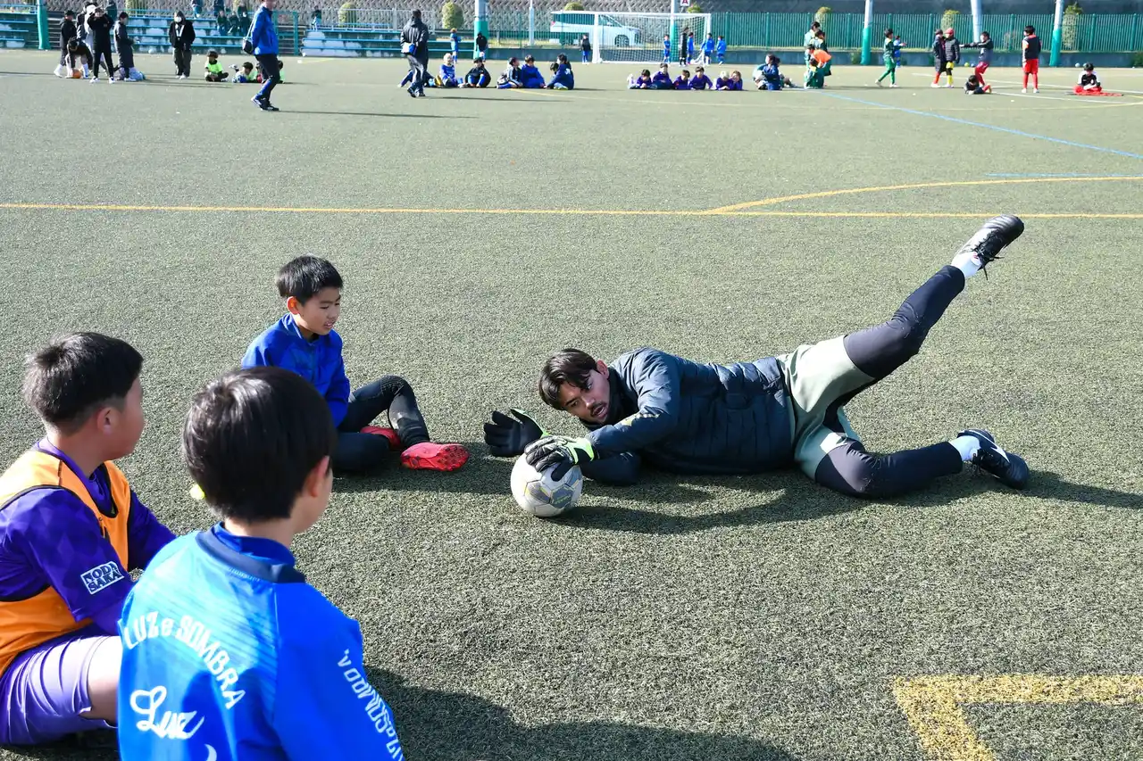 福井選手は、「キーパーってポジションを楽しんでもらえたらと思います」と前置きをした後に、セービングのポイントを順番に説明。「意識してほしいのは、地面と手で壁をつくること。次に上からふたをしてボールをしっかりとキャッチすること。ボールが緩いとその分足を運んでキャッチしてください」と実際に大きく体を動かして実践。子どもたちの喜ぶ表情を見て、「サッカー選手って、子どもたちに夢を与えられる仕事だっていうことも感じますね」と振り返りました。 |