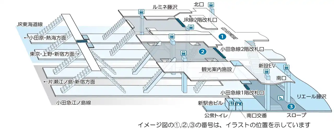 なお、2階改札口とホームをつなぐエスカレーター及びエレベーターは、2027年(令和9年)3月までに使用開始することを目指しており、既存の自由通路内のエレベーターと1階改札口は引き続きご利用いただけます。今後につきましては2028年(令和10年)3月末の完成を目指し、本協定に基づく「藤沢駅南北自由通路拡幅事業及び藤沢駅改良事業」を進めてまいりますので、引き続きよろしくお願い申し上げます。 |