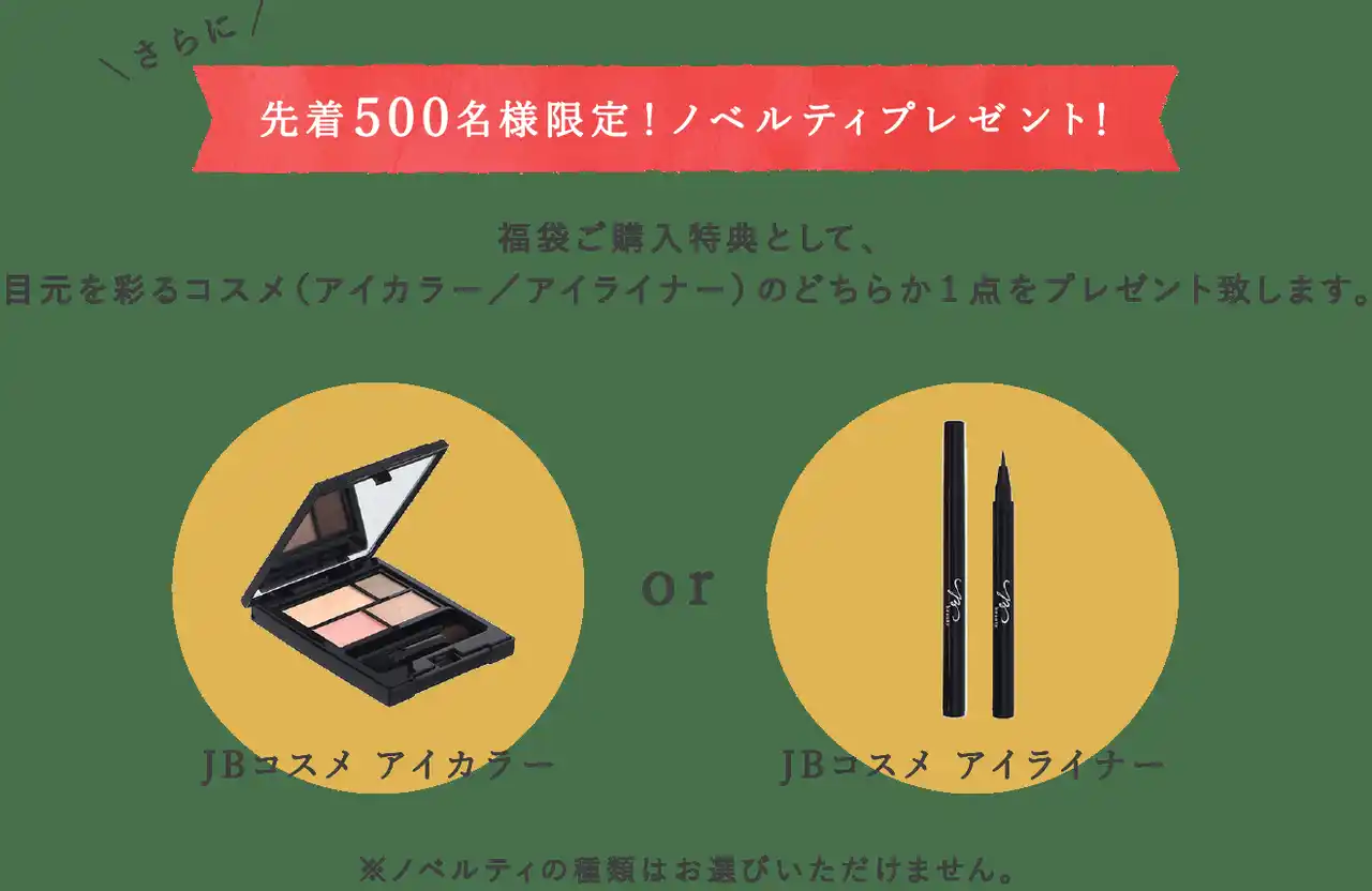 さらに、福袋購入特典として、先着500名限定で目元を彩るコスメ(アイカラー / アイライナー)のどちらか1点をプレゼント致します。 |