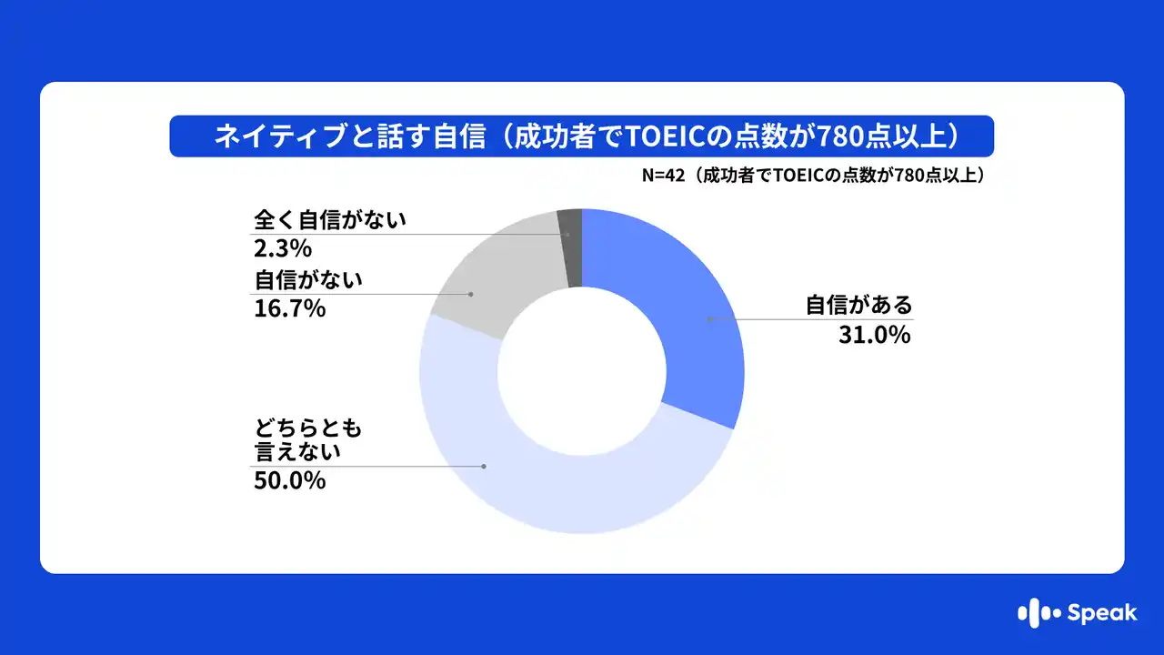 ・英会話学習成功者で、TOEICの点数が780点以上と高得点の方に限定して、同じく英会話力の自信を確認すると、自信がある(非常に自信がある、自信があると回答した合計)と答えたのはわずか31.0%に留まりました。 |