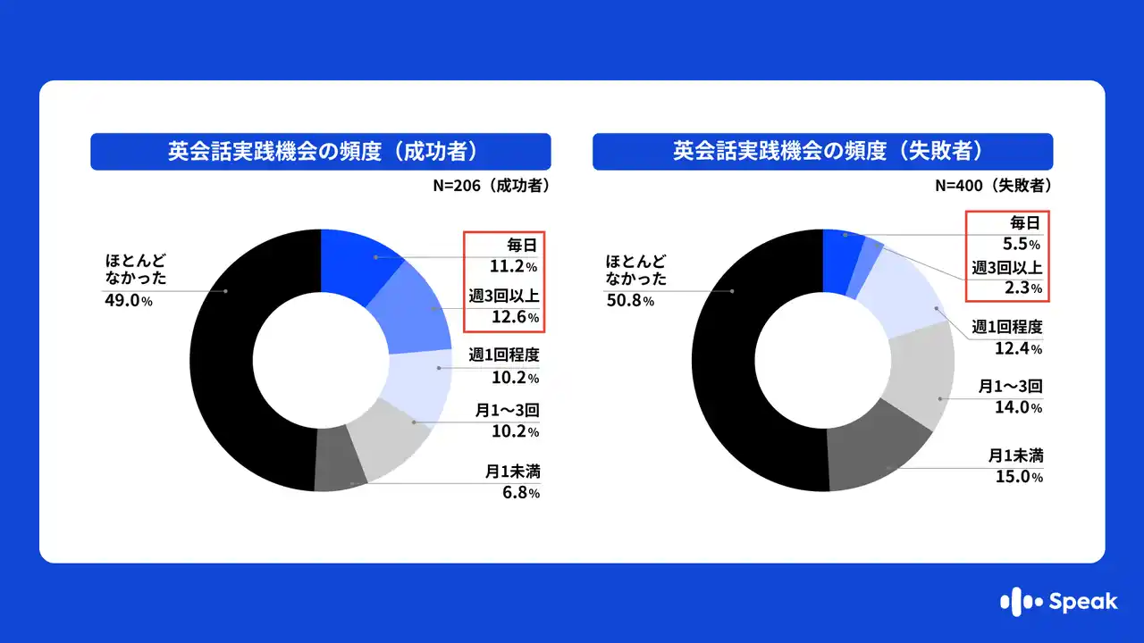 1.【頻度の格差】英会話学習の成功者は、失敗者に比べて「週3回以上英語を話す」割合が約3倍高いことが判明! |