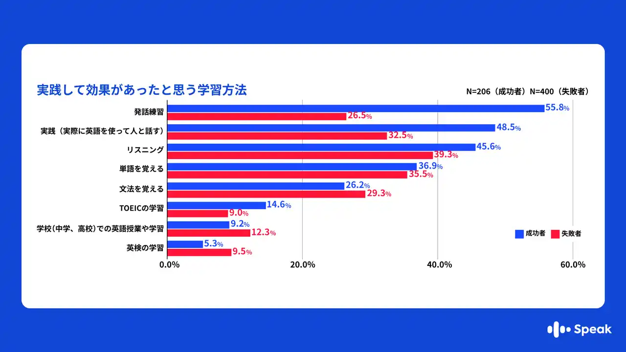 ・「効果があったと思う学習方法」についての回答も対照的な結果が見られました。 成功者が挙げた2トップは1位「発話練習(55.8%)」と2位「実践会話(48.5%)」であり、実際に英語を声に出すアウトプット型の学習を重視しています。 |