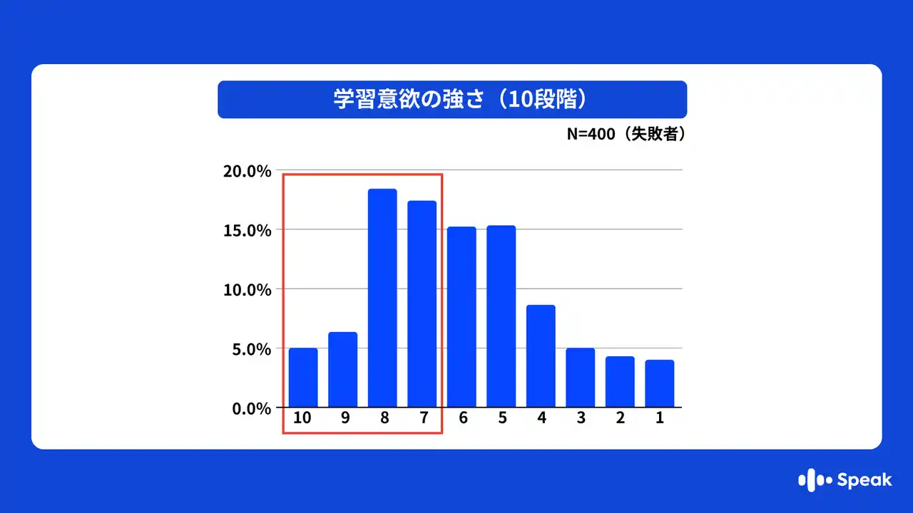 ・失敗者の学習開始時の意欲(モチベーション)は10点満点中「7~10点」の高得点者が多く、やる気不足が原因ではないことが伺えます。 |