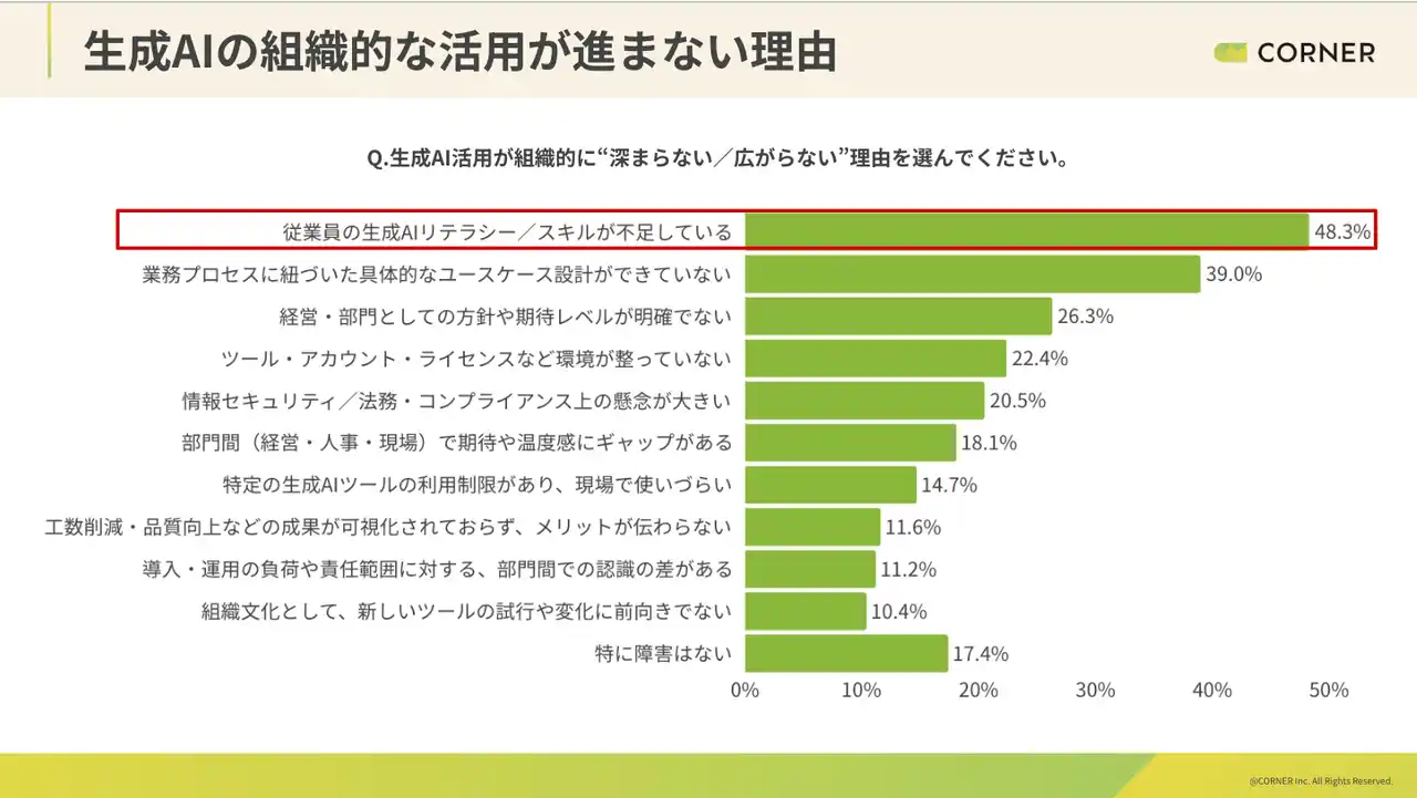従業員のリテラシー/スキル不足が圧倒的に多く挙げられており(48.1%)、業務プロセスと紐付いた具体的なユースケース設計ができていない(39.0%)が次に多い。全体的には業務・組織設計に起因する要因が続いている。生成AIは導入されつつある一方で、それを組織の業務や意思決定に組み込む設計が追いついていない構造が確認できる。 |